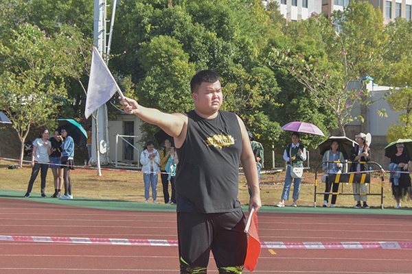 外国语学院英语16-3班的甘旭燊同学是铅球项目的裁判,他做着普通而又神圣的工作,见证了赛场上令人激动的时刻。甘旭燊认为,有些初次参加比赛的运动员对比赛规则把握不够准确,所以裁判员要更加了解规则,这样才能维持赛场上的秩序,保证整场比赛的公平公正,让运动员们放心比赛。