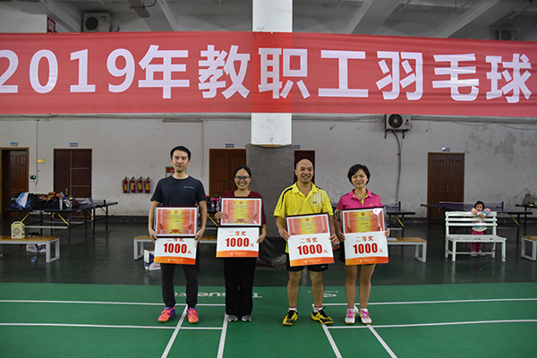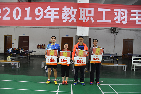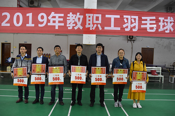 10月25日晚上,由学校工会、体育教学部共同主办的beat365英国官方网站2019年教职工羽毛球团体赛圆满结束,来自学校分工会的23支队伍参赛,参与人数超过300人。学校副校长王敦球为获奖队伍颁奖。