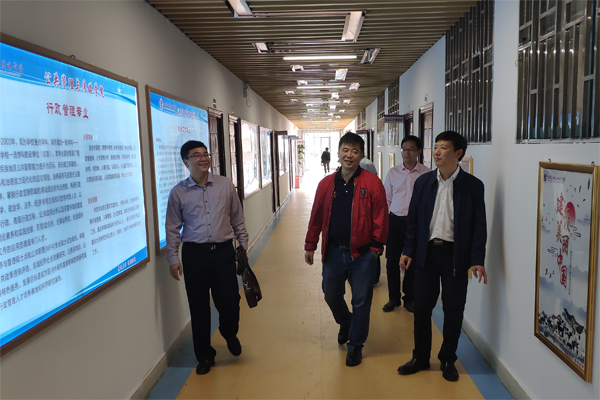 解庆林校长(右)与朱剑飞教授(中)一同考察传媒学学科部分实验场地与设备