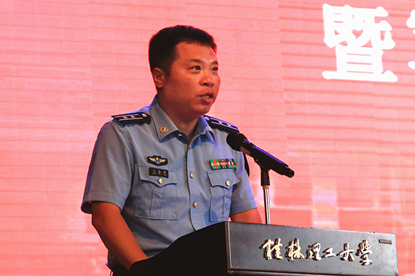 中国人民解放军95339部队王参谋长在典礼上讲话。他向全体承训教官严格要求,希望全体新生敢于吃苦,敢于锻炼,激发斗志,磨炼意志,切实做到军人“流血流汗不流泪,掉皮掉肉不掉队”的要求,像军人一样炼就铁骨铮铮、硬气朗朗,以良好的精神面貌和坚韧的意志品质续写大学生活的别样精彩。