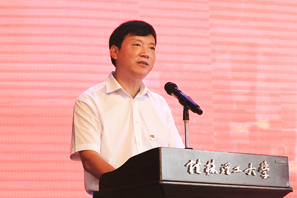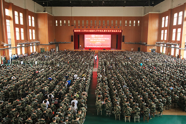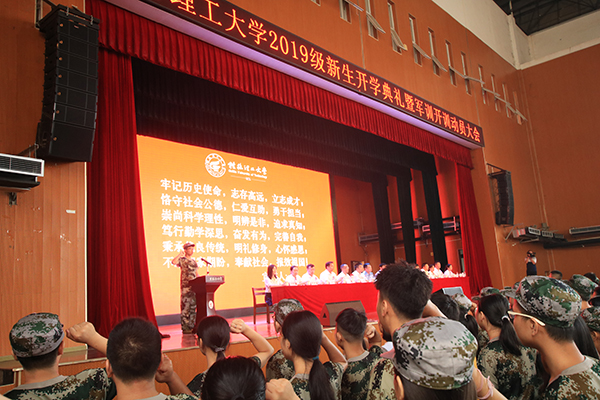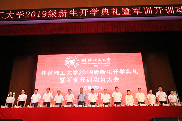 学校解庆林校长在典礼上致辞。他首先代表全校师生,对南宁分校4473名2019级新同学表示热烈的欢迎,向辛勤培养同学们的老师和家长们致以最崇高的敬意,向承训的中国人民解放军95339部队和扶绥县人民武装部全体官兵表示最衷心的感谢,并对全体新生提出四点要求:一是要热爱祖国,厚植家国情怀,做坚定的爱国者。要听党话、跟党走,胸怀忧国忧民之心、爱国爱民之情,奉献祖国、奉献人民,以一生的真情投入、一辈子的努力奋斗,使自己成为合格的爱国者、坚定的爱国者。二是要热爱学习,练就扎实本领,做合格的社会主义建设者。要潜心研究,勇于实践,知行合一,勇于追求卓越,全面提升综合素质,努力成为有真才实学的合格的新时代社会主义建设者。三是要明德修身,培养高尚品德,做可靠的社会主义接班人。要秉承“厚德笃学 惟实励新”的校训精神,把“厚德”摆在首位,做到明德修身,培养高尚的品德,做有益于人民的人,努力使自己成为社会主义可靠接班人。四是要尚美修心,涵养美好人生,做格调高雅的桂工人。要注重理性思维的培养及感性思维的提升,要努力培养美的言行、美的情操和美的灵魂,使自己成为一个格调高雅的桂工人。