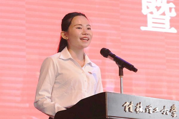 老生代表土木与测绘工程系2016级工程管理专业宋雨潞鼓励2019级新生们立德树品、不忘本心,做“有理想、有追求,有担当、有作为,有品质、有修养”的当代大学生;志存高远、铸就梦想,做一个有抱负、有学识、有社会责任感的人,成为桂工的骄傲榜样、社会的中坚力量、国家的栋梁之材。