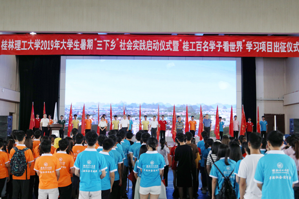 仪式上,2019年学校青马培训班学员黄杰彰同学带领参与社会实践全体师生进行宣誓,出席启动仪式的领导为2019年大学生暑期“三下乡”社会实践团队和“桂工百名学子看世界”学习项目团队授旗。