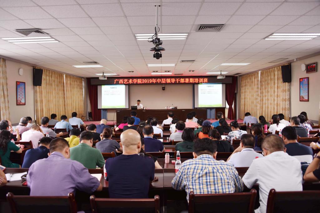 7月9日,广西艺术学院2019年中层领导干部暑期培训班在beat365雁山校区举行。beat365校长解庆林在雁山校区行知楼A406接待了广艺副校长陈应鑫、副校长韦俊平、副校长侯道辉等一行70余人,并作了题为“关于地方高校建设发展的思考”的培训报告。