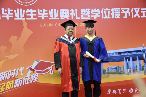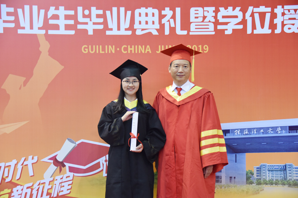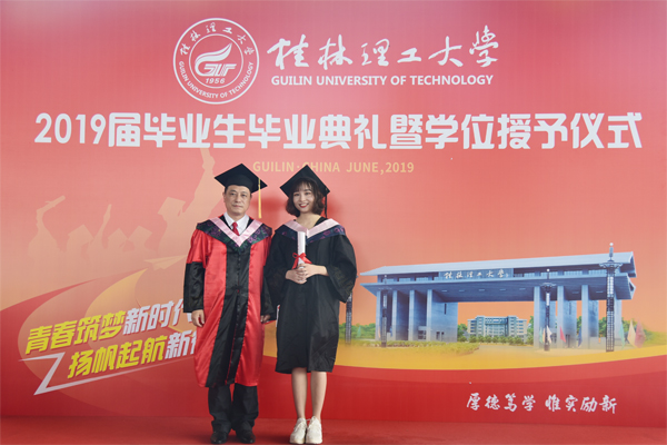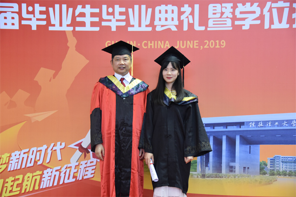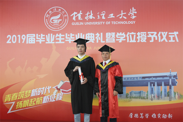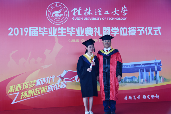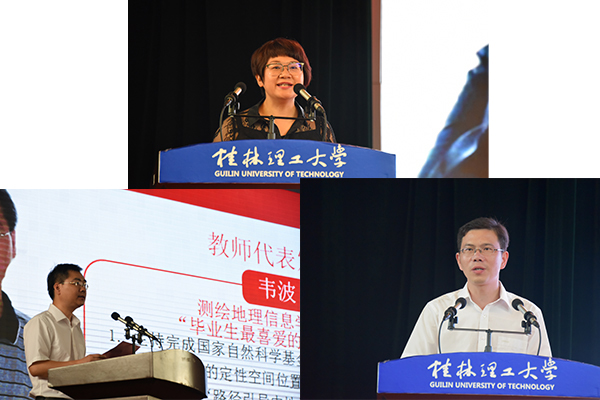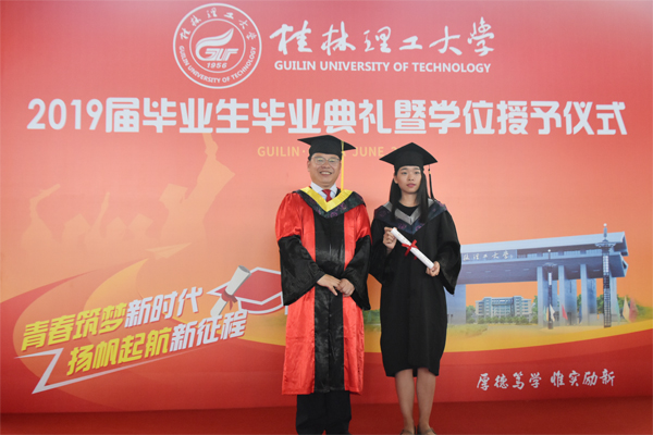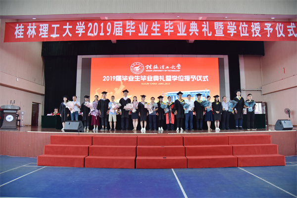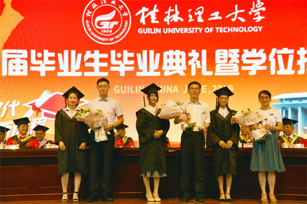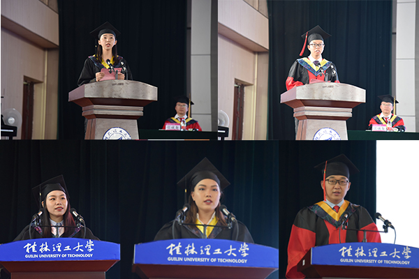 地球科学学院赵亚男、环境科学与工程学院林局、商学院梁秋宁、材料科学与工程学院相怀成、国际教育学院留学生林紫靖代表2019届毕业生发言,他们诚挚地表达了对母校和老师们的感恩之情,并表示将始终秉承“厚德笃学,惟实励新”的校训,勇敢迎接人生新的挑战,不辜负母校和师长的期望,为中华民族伟大复兴贡献桂工力量。测绘地理信息学院韦波老师、商学院侯治平老师作为教师代表发言,为2019届毕业生送上美好祝福,希望每一位桂工毕业生,能在人生新的征程中实现梦想、收获幸福。beat365高分子94级校友、莱倩国际化妆品集团董事长谢腊梅女士作为校友代表发言,她和毕业生们分享了自己16年创业生涯的经历和感悟,并希望毕业生们传承桂工精神,用爱点燃梦想,成为未来学弟学妹们的榜样,成为桂工的骄傲!