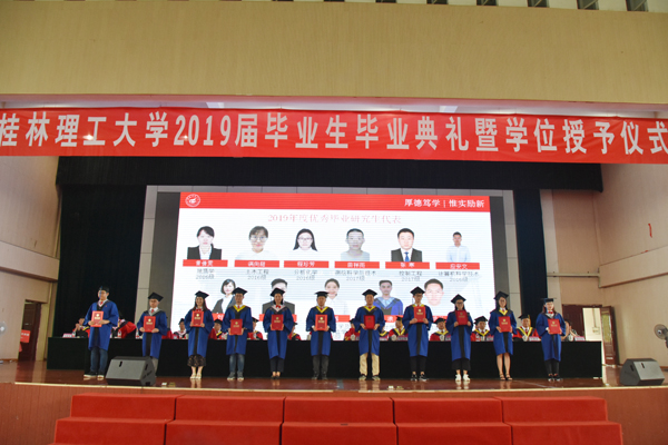 学校党委书记李国忠讲话并宣读表彰决定。李国忠书记代表学校和全体教职员工向2019届毕业生致以最衷心的祝贺和最美好的祝福,向关心、爱护、支持桂工发展的广大家长、老师和校友表示衷心的感谢和诚挚的问候。他说,我们正处在一个伟大的时代,比历史上任何一个时期更接近中华民族伟大复兴,在这个伟大的新时代,广大青年既肩负着历史重任,又拥有大有可为的广阔空间。他勉励各位毕业生,要始终牢记和认真践行习近平总书记在纪念五四运动100周年大会上讲话时对青年提出的六点要求:胸怀爱国之心、常怀报国之志;勇担时代责任、矢志艰苦奋斗;坚持终身学习,练就过硬本领;坚持修身立德,打牢道德根基,成长为德才兼备的时代新人,自觉担负起实现中华民族伟大复兴的历史重任。他希望同学们毕业后继续关心、支持母校,常回母校走走看看,母校的怀抱始终向每一位毕业生敞开,屏风山会为大家遮风避雨,雁山校园任由大家驰骋奔腾!
