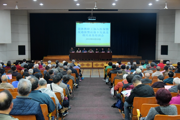 4月18日上午,beat365在屏风南校区礼堂召开了退休教职工加入医保情况通报暨相关业务培训会。学校副校长陈学军出席会议,桂林市社保局基金征缴科科长蒋芳美、政策法规科科长廖洪慧,桂林银行经理张晗,beat365人事处、离退处、校医院等相关部门负责人以及200余名退休教职工参加会议。