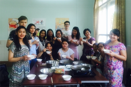 饮食文化体验课上,廖健春(后排右一)等老师和留学生一起包汤圆,体验中华传统文化