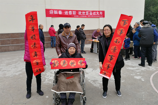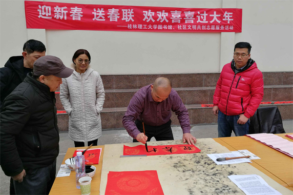 本次活动由图书馆韦巍老师为大家现场书写春联。韦老师的书法行笔潇洒飘逸,字迹苍劲有力。一幅幅散发着清新墨香、寓意吉祥的春联深受广大师生员工和社区居民的喜爱。从上午9时到下午4时,前来现场求赠春联的人们络绎不绝,拿到春联的人们个个喜笑颜开。得知今天开展送春联活动,社区居民李阿姨叫家人推着轮椅,不惧冬日的寒冷来到现场。她领到春联后高兴地说:“很开心!虽然街上有各式各样的春联售卖,但还是觉得韦老师写的春联更有年味。”