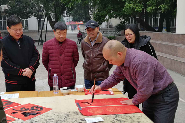 韦巍老师(右二)不辞辛劳、专心致志地为大家写春联