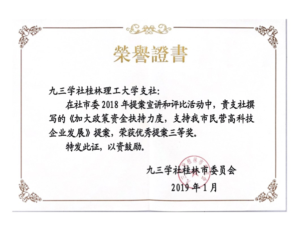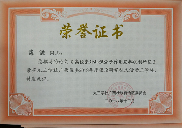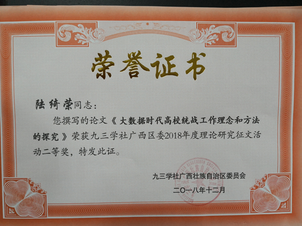 新年伊始,九三学社广西区委、九三学社桂林市委分别对2018年度理论研究征文活动和2018年提案宣讲评比活动中的获奖个人、集体进行了表彰,beat365九三支社社员精心准备、积极参与。其中陆绮荣老师撰写的论文《大数据时代高校统战工作理念和方法的探究》荣获九三学社广西区委2018年度理论研究征文活动二等奖,海洪老师撰写的论文《高校党外知识分子作用发挥机制研究》荣获九三学社广西区委2018年度理论研究征文活动三等奖;学校九三支社在社市委2018年度基层组织目标管理项目评比中荣获二等奖,支社提交的《加大政策资金扶持力度,支持我市民营高科技企业发展》提案,荣获社市委2018年提案宣讲和评比三等奖。