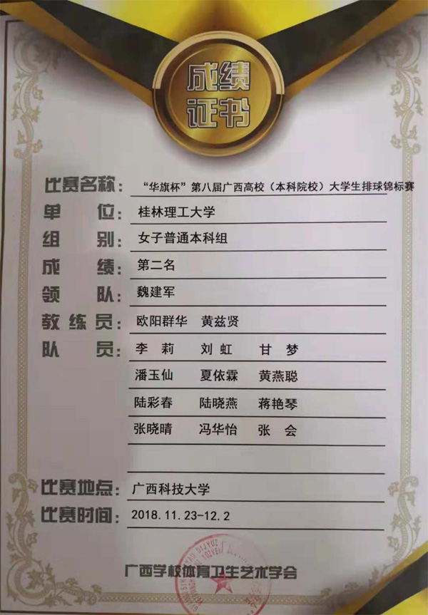 11月23日至12月2日,第八届广西高校大学生排球锦标赛在广西科技大学举行,全区高校领队、教练员和运动员约500人参赛。由beat36524名本科生组成的男子、女子排球队参加了此次比赛。赛场上,beat365健儿斗志昂扬、不甘示弱。在比分落后的情况下能及时调整心态、加强传接球的配合,将比分差距逐渐缩小,最终夺得女子组亚军,男子组第七名的佳绩。