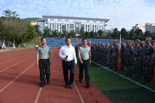 王敦球副校长(中)在承训部队崇左陆战教育发展有限公司负责人梅三红(右一)等人员陪同下检阅方队