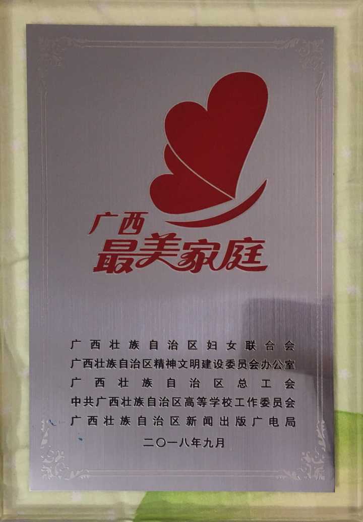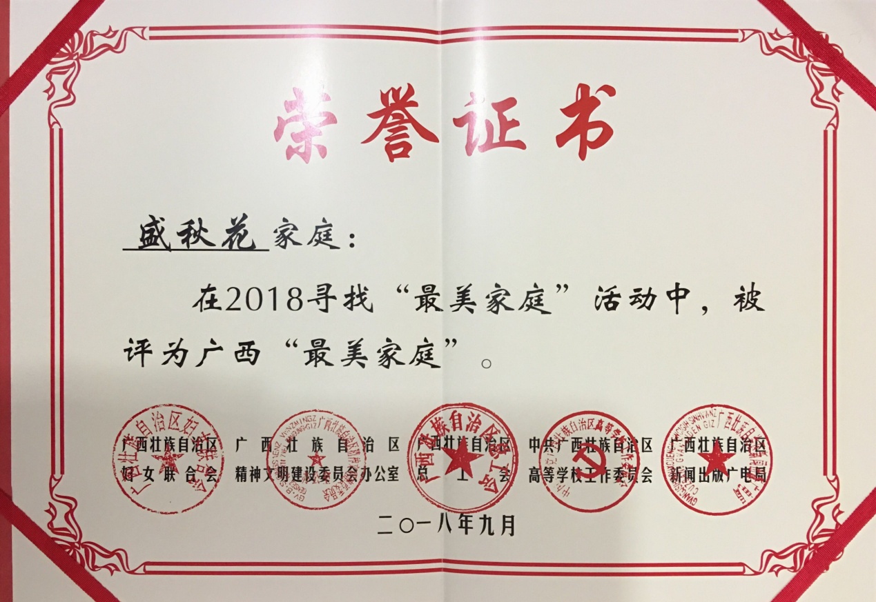 近日,自治区妇联、自治区文明办、自治区总工会、自治区高校工委、自治区新闻出版广电局联合下发了“关于授予覃桂新家庭等110户家庭2018年广西‘最美家庭’的决定的通知”(桂妇发[2018]5号),公布了2018广西“最美家庭”名单,beat365附属小学分工会盛秋花家庭名列其中,获此殊荣。