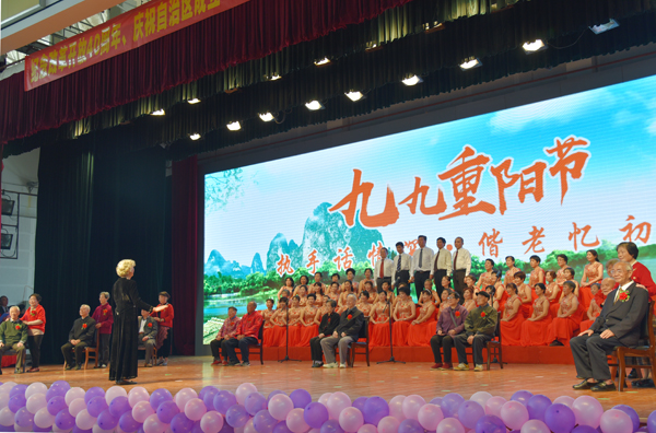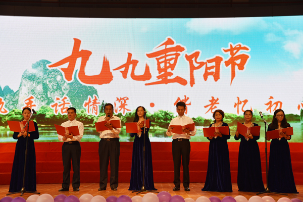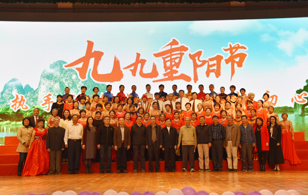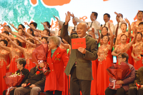 孙宁副书记在艺术展演活动上为2018年14对钻石婚夫妇、8对金婚夫妇代表送上鲜花和慰问金,并代表学校祝愿所有的老同志节日快乐、健康长寿!对老同志长期以来在支持学校改革、发展、稳定等各项事业中做出的贡献表示衷心感谢!他表示,学校将一如既往地采取更加有力的措施,把离退休工作做好,确保老同志生活更幸福、更快乐!他说,尊老敬老不仅是中华民族的传统美德,也是桂工的优良传统,希望年轻师生多向老同志学习,以艰苦奋斗的精神、勤恳务实的态度、勇于开拓的气魄,努力创造新业绩,为实现学校“双一流”发展目标做出更大的贡献。