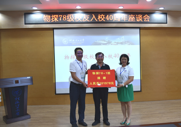 座谈会上还举行了校友捐赠仪式。物探78级校友捐赠人民币101978元支持母校的建设发展,同时作为物探78级校友入校40周年的纪念。陈学军副校长代表学校接受捐赠,并颁发捐赠证书。当天上午,校友们还乘车到雁山校区参观了校史馆和地质博物馆。