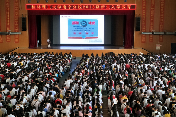 9月12日下午,学校校长解庆林在空港校区体育馆为南宁分校2018级新生作题为“弘扬‘桂工精神’,志存高远,立志成才!”的入学教育报告。报告会由学校校长助理、分校校长冯兵主持。