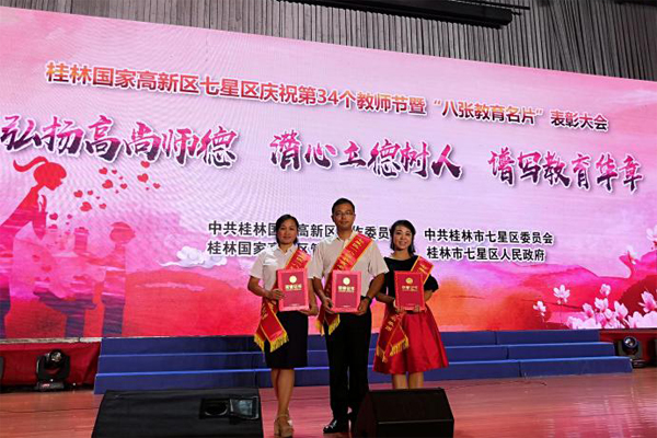 9月9日下午,桂林国际会展中心国际会议厅里喜气洋洋,桂林国家高新区七星区庆祝第34个教师节暨“八张教育名片”表彰大会在这里隆重举行。beat365附属小学谢培、李艳华、秦秋三位老师获得表彰。