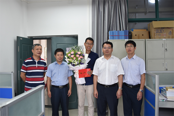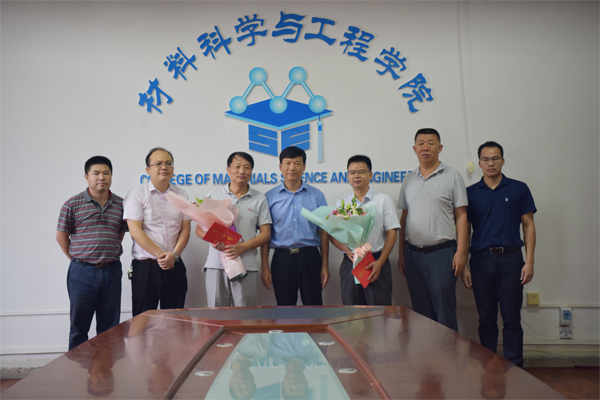 学校校长解庆林(左四)慰问材料科学与工程学院周炳老师(左三)、匡小军老师(右三)