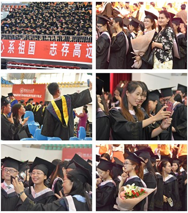 毕业典礼结束后,校领导为毕业生行拨穗礼、颁发学位证书,并与毕业生合影留念。