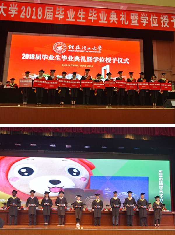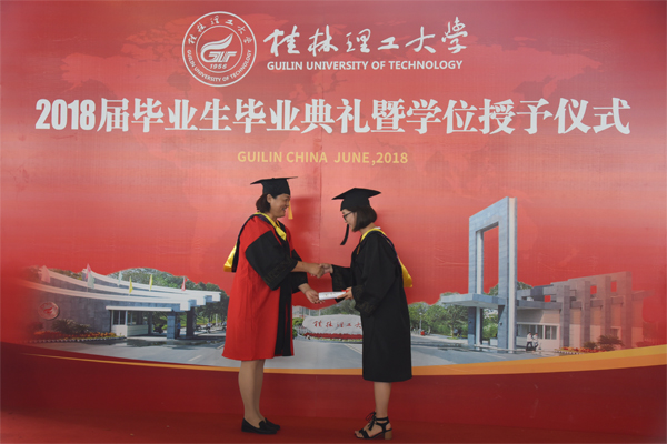学校对彭荣慧等405名优秀大学毕业生、韩亚梅等43名优秀毕业研究生、付天娇等4名研究生支教团成员、蒋轩敏等14名大学生志愿服务西部计划志愿者、卿佳容等73名广西壮族自治区普通高等教育优秀大学毕业生予以表彰。在主席台前排就坐的领导为优秀毕业生代表、研究生支教团成员、志愿服务西部计划毕业生、考取硕士研究生的本科毕业生代表颁发了荣誉证书。