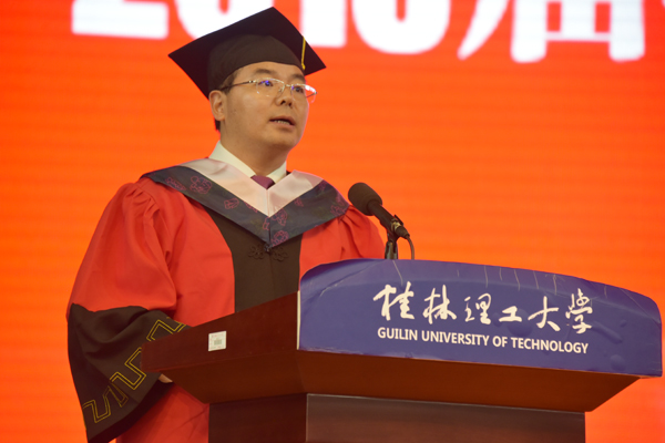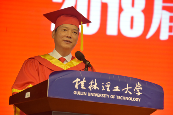 环境科学与工程学院雷壮、外国语学院张静、商学院乔阳阳、材料科学与工程学院徐旭代表2018届毕业生发言,他们诚挚地表达了对母校、对师长的感恩之情和传承“桂工精神”、怀揣梦想、报效国家的信心与决心。地球科学学院赵义来老师、材料科学与工程学院龙飞老师作为教师代表发言,为2018届毕业生送上诚挚的祝福,希望大家牢记母校“厚德笃学、惟实励新”的校训,勤奋努力、脚踏实地,创造美好未来。旅游与风景园林学院本科毕业生唐新瑶同学父亲唐淼先生、土木与建筑工程学院本科毕业生温儒林同学父亲温福生先生作为毕业生家长代表发言,勉励大家常怀感恩之心,常思创新之道,常行担当之举,以优异成绩报效国家、回报母校!beat365浙江宁波校友会会长、地质79级校友周晗先生作为校友代表发言,他和毕业生们分享了自己多年来的经历和感悟,告诉毕业生们 “桂工人”这个烙印将永远把大家紧密联系在一起,并祝福同学们“长风破浪会有时,直挂云帆济沧海!”