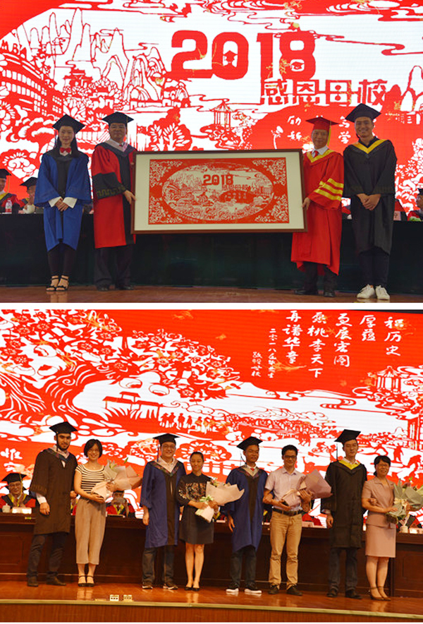 各学院毕业生代表上台接受了学校赠送给每一位毕业生的礼物——一枚镌刻有学校LOGO、毕业生姓名的2018届毕业生专属鸡血玉印章。2018届毕业生为了表达对母校的感恩之情,特精心准备了一幅寓意着感恩、祝福、喜庆、吉祥的剪纸作品赠送给学校,感谢母校的精心栽培,并祝愿母校日新月异,再谱华章,桃李满天下,美名扬四海!