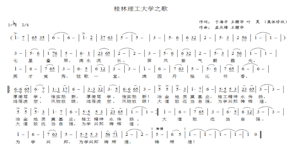 七星叠翠,漓水流长,屏风紫气蔚霞光。英才竟秀,弦歌一堂,满园丹桂沁书香。厚德笃学,惟实励新!厚德笃学,惟实励新!冶金地质奠基业,桂工精神永传扬。鸿雁凌空,风物放眼!鸿雁凌空,风物放眼!大道致远当自强,为学兴邦筹辉煌。