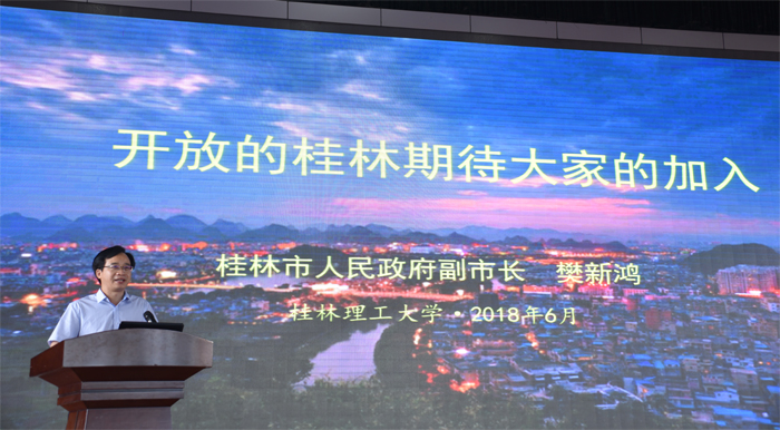 樊新鸿副市长围绕“开放的桂林期待大家的加入”这一主题,从“五个不一样”的角度介绍了桂林在地域区位、交通条件、生活成本、山水文化、产业人才等方面的优势以及桂林在电子信息、先进装备制造、医药及生物制品和生态食品四大优势产业相关情况。他代表市政府向各位毕业生和有志青年发出诚挚邀请:扎根桂林实现自己的人生价值,让桂林这座迷人的城市在大家的共同努力下,更加美丽繁荣,携手将桂林的“绿水青山”变成“金山银山”。
