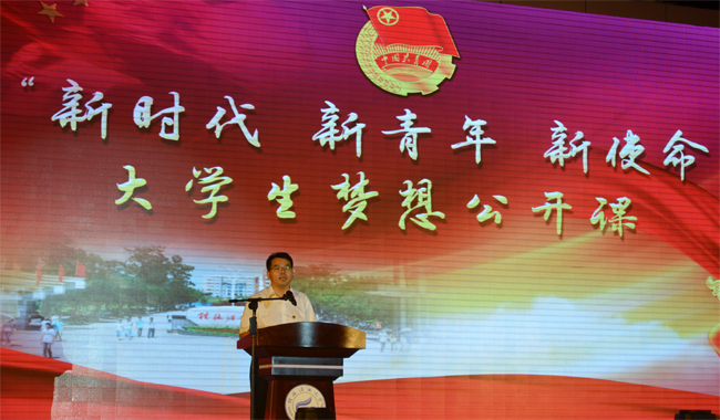 为继承和弘扬“五四”精神,教育和引导广大青年坚定信仰、砥砺品德,努力成长为有理想、有本领、有担当的社会主义建设者和接班人,5月4日晚,学校纪念“五四”运动99周年暨“新时代 新青年 新使命”大学生梦想公开课在雁山校区体育综合训练馆隆重举行。学校党委书记李国忠,党委副书记王赣华,桂林市灵川县公平乡党委副书记、乡长蔡平出席了梦想公开课,党(校)办、组织部、宣传部、学工部(处)、校团委等部门负责人以及青年师生代表2000余人参加了公开课。