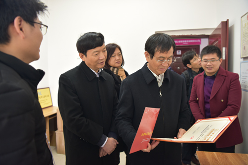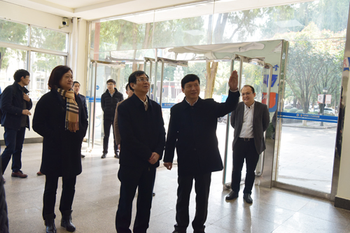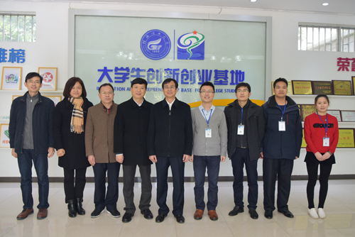 广西科协赵艳林主席(前中)在解庆林校长(前右)、副校长王玫(前左)陪同下参观大学科技园