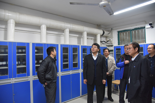李国忠书记(左二)在化学与生物工程学院危险化学品库房询问安全管理措施
