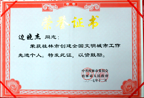 校团委边晓杰同志荣获桂林市创建全国文明城市工作先进个人荣誉称号
