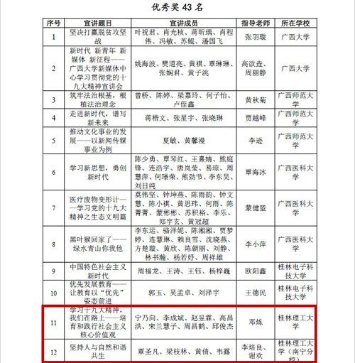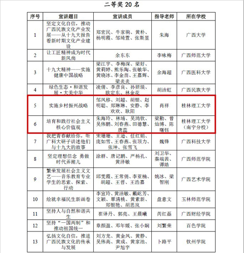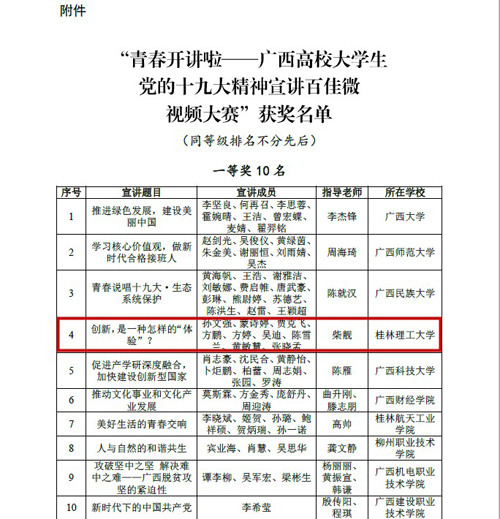 近日,“青春开讲啦——广西高校大学生党的十九大精神宣讲百佳微视频大赛”获奖名单公布。beat365选送作品取得了优异成绩,其中《创新,是一种怎样的“体验”?》获得一等奖、《实施乡村振兴战略》及《培育和践行社会主义核心价值观》两件作品获得二等奖、《实践中理解中国特色社会主义新时代》获得三等奖、《学习十九大精神,我们在路上——培育和践行社会主义核心价值观》及《坚持人与自然和谐共生》两件作品获得优秀奖。