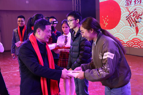 学校副厅级调研员张劲松为在抽奖互动环节获奖同学颁发奖品并致以新年祝福