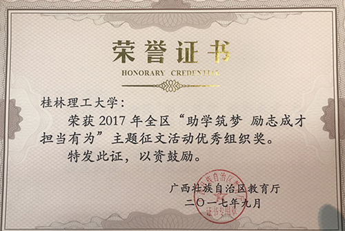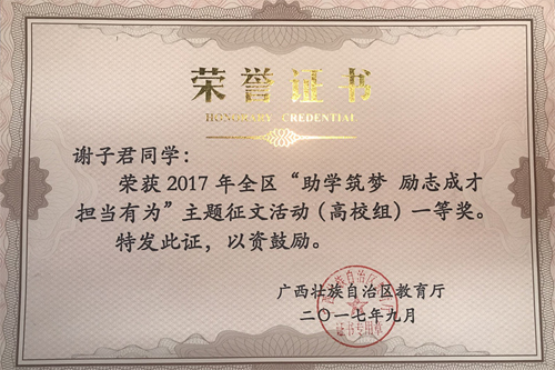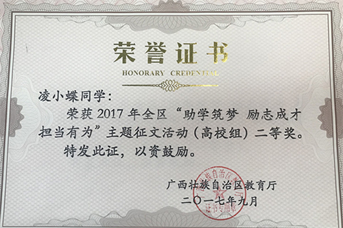 近期,由自治区教育厅主办的2017年全区“助学筑梦,励志成才,担当有为”主题征文活动评审结果揭晓,beat365选送的两篇参赛文章均取得优异成绩。其中,旅游学院2015级谢子君同学的文章《竹篓下的逐梦之路》获得全区一等奖(高校组第一名),旅游学院2015级凌小蝶同学的文章《坚为扁舟至彼岸,爱化雨露报恩情》获得全区二等奖。旅游学院黄小华老师、学生工作部(处)慕宗良老师被评为优秀指导教师。beat365获得本次活动优秀组织奖,这也是beat365自2013年起连续五年获得全区主题征文活动优秀组织奖。