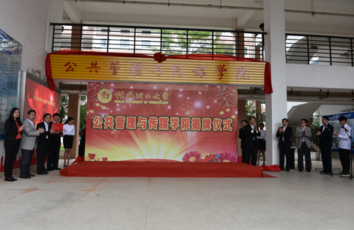 解庆林校长在仪式上宣读了更名文件并指出,为适应高等教育发展的新形势、新要求,进一步优化学科布局,强化学科建设,学校经过认真论证、慎重研究,决定同意将人文社会科学学院更名为公共管理与传媒学院。