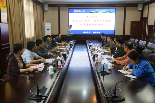 11月9日下午,科技厅唐咸来副厅长带队来beat365调研自治区重大科技专项实施情况,科技厅高新处杜文宏处长、李思源调研员、胡江波以及桂林市科技局黄强局长、钟可安副局长和唐健梅副局长陪同调研。调研活动在beat365屏风校区教八楼三楼会议室和大学科技园举行。