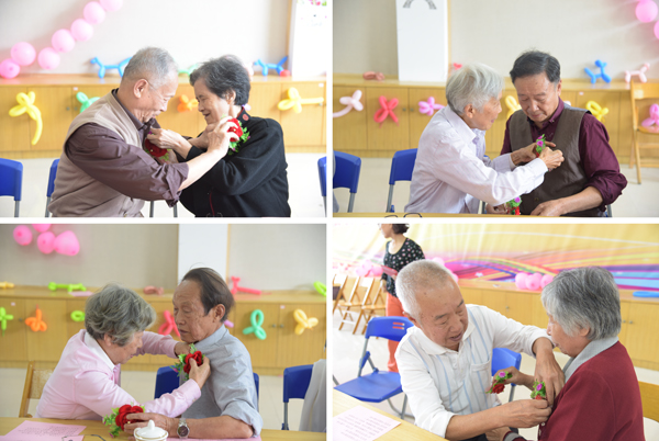 相守五六十年的耄耋“新人”手拿红花,互相佩戴,传递重阳温暖