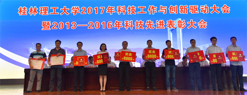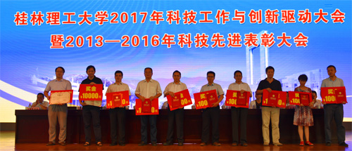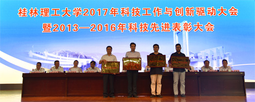 王赣华副书记宣读了《beat365英国官方网站关于表彰2013—2016年度学校“科技工作先进集体”、“十佳科技工作者”和“十佳青年科技工作者”的决定》。与会校领导为获奖集体和个人颁奖。2013-2016年“科技工作先进集体”获奖代表环境科学与工程学院副院长(主持工作)游少鸿教授,2013-2016年“十佳科技工作者”获奖代表、国家优青获得者、材料科学与工程学院匡小军研究员,2013-2016年“十佳青年科技工作者”获奖代表、管理学院李雷博士先后作了典型发言,他们代表学校广大科技工作者,衷心感谢学校党委行政给予的大力支持和鼓励,表示将为学校“双一流”建设等各方面工作努力发挥自己应有的作用,为把学校基本建成特色鲜明的高水平教学研究型理工大学做出新的更大的贡献。