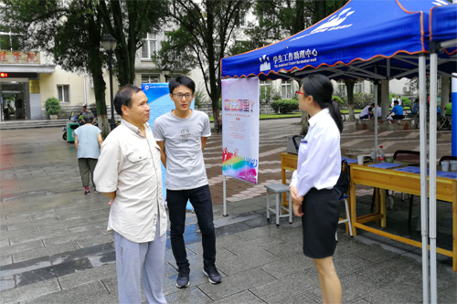 周国清副校长(前排左一)到研究生迎新工作点了解工作情况