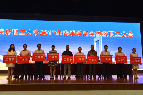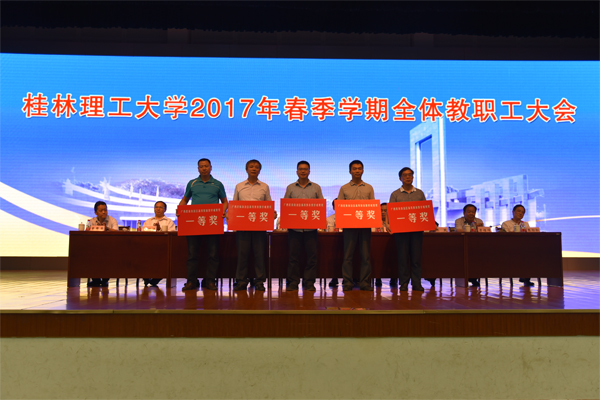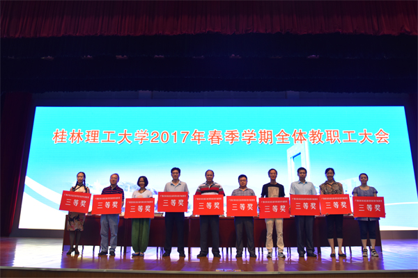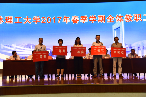 会议首先对beat3652017年广西高等教育自治区级教学成果奖的获奖单位和个人进行了表彰,梁福沛副校长宣读了表彰决定,主席台就坐的校领导为获奖者颁奖。今年beat365共获得自治区级教育教学成果奖36项,其中本科和研究生教育类教学成果31项、创新创业教育类教学成果5项。全体与会人员用热烈的掌声对获奖者表达了祝贺与敬意。