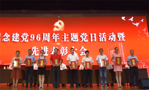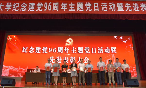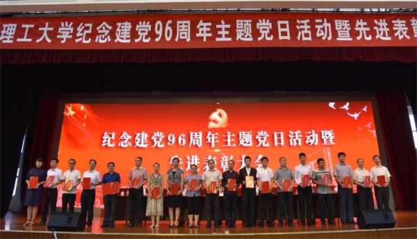 学校对获得2015-2017年度先进的10个基层党组织、45名优秀共产党员、10名优秀党务工作者,以及14个党风廉政建设优秀成果获奖单位、11个庆祝建党96周年主题党日活动获奖单位进行表彰。校领导为获奖集体和个人颁发了荣誉证书。会上,50多名新党员面向党旗庄严宣誓,正式加入党组织。