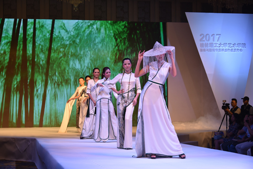 2017届服装与服饰设计专业毕业作品发布会以“Exotic异族珍奇”、“Epoch时代纪元”、“Energy活力创想”、“Elegant优雅永恒”为单元主题,共同铸就了发布会的“布同凡想”。发布会展示了包括礼服设计、创意设计、成衣设计、民族主题设计四大方面的29个系列共计159套作品,是2017届服装与服饰设计专业毕业生致敬青春,向社会舒展自己的才华,向母校表达谢意的完美展示。发布会节奏紧凑、类型多元、亮点纷呈、创意十足,从民族风情到时尚主题,多层次、多角度展示了本届学子的服装设计水平和群体风貌,既体现了传统与时尚的相互交融,又将成长蜕变凝结于艺术作品中,作品里凝聚着导师们的辛勤汗水,也饱含着学生的巧妙构思与旺盛的艺术创造力。其中作品《越简越繁》获得了2017“VGRASS•东华杯”第十一届中国大学生服装立体裁剪设计大赛优秀奖,也是广西服装院校在此类专业大赛中首次获奖。