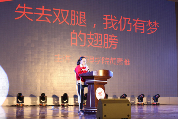 今年的“五四”纪念活动通过创新团课形式,邀请九位团员分别从信仰、担当、创新、梦想四个主题与同学们分享他们奋斗青春的故事。在第一课“信仰”中,中国大学生自强之星提名奖、团中央“践行社会主义核心价值观先进个人”、中国科学院直博生孙娟娟同学通过讲述个人刻苦钻研,发奋学习的故事,号召广大青年,坚定理想信念,努力成为一个有理想、有追求、有抱负,脚踏实地、艰苦奋斗的人。公开课的第二课为“担当”,自治区教育厅“关爱瑶寨留守儿童”志愿服务项目负责人毛任平同学、第十七届研究生支教团团长白宇航、学校十佳团支书代表卞霄同学、环境学院暑期优秀社会实践项目代表冯健同学及第四期青马班学员谭昊磊,分别分享了他们开展志愿服务和社会实践的青春故事。在“创新”课堂中,学校机器人创新实践基地学生负责人曹鹏同学与第十四届“挑战杯”全国大学生课外学术科技作品竞赛一等奖项目负责人凌亚萍同学分别讲述了自己在学生科技方面潜心钻研、勇于创新故事。在最后的“梦想”一课中,广西优秀共青团员获得者黄素雅同学讲述了她的梦想,虽然失去了双腿,但她通过自己的坚强和拼搏,插上逐梦的翅膀继续飞翔,感人的事迹引起了在场学生的强烈共鸣。