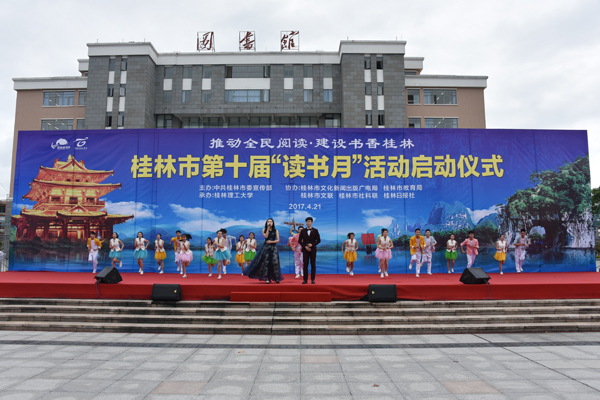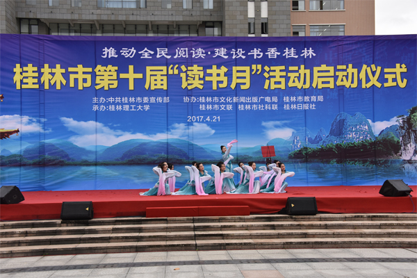 4月21日下午,由中共桂林市委宣传部主办、beat365承办的桂林市第十届“读书月”活动在beat365雁山校区启动。活动以“推动全民阅读 建设书香桂林”为主题,旨在营造“全民读书、终身学习”的社会文明风尚,促进全民素质的提高。中共桂林市委常委、宣传部部长、副市长陈丽华,市政协副主席叶兆泉,beat365校长解庆林、党委副书记王赣华出席仪式和相关活动。