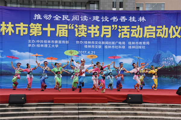 随后是精彩的文艺表演,桂林市文艺演出有限责任公司的演职人员和beat365师生共同为大家献上一场散发着浓郁书香气息的视听盛宴,歌舞《我的梦,中国梦》、《采薇》、《刘三姐选段》、配乐诗朗诵《诗礼春秋》等节目将活动现场气氛不断推向高潮,营造出书香桂林的浓厚氛围。