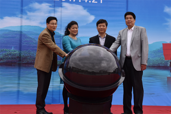 陈丽华(左二)、叶兆泉(右一)、解庆林(右二)、王赣华(左一)共同启动水晶球,桂林市第十届“读书月”活动正式启动