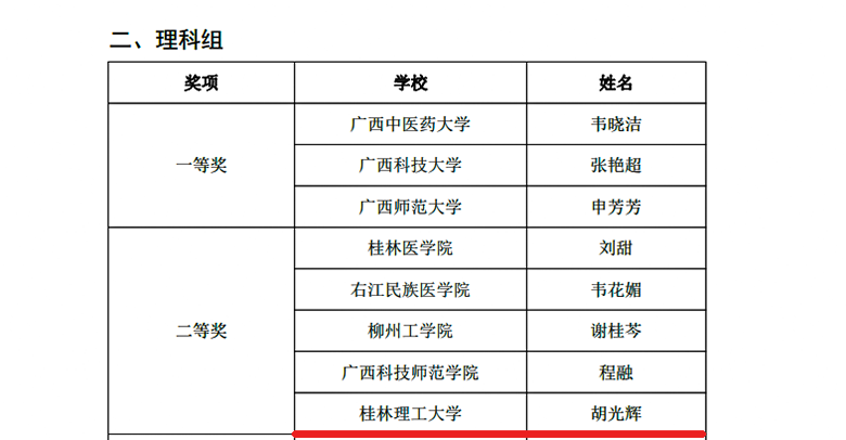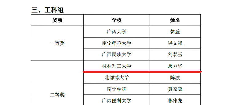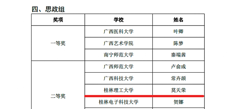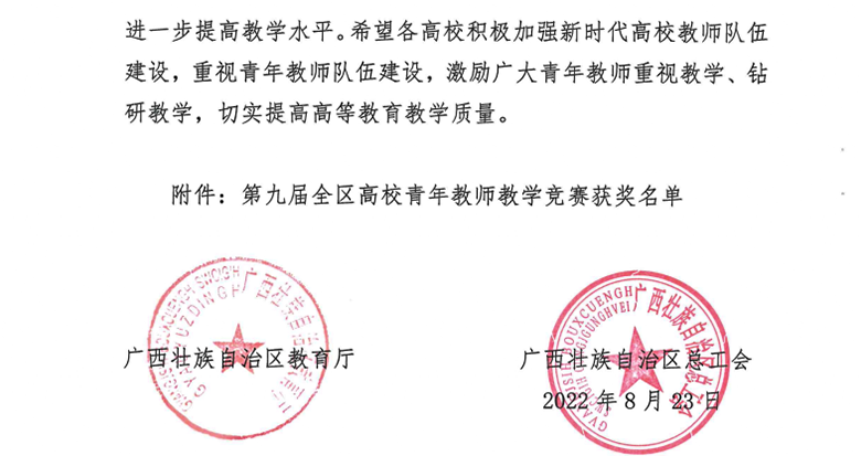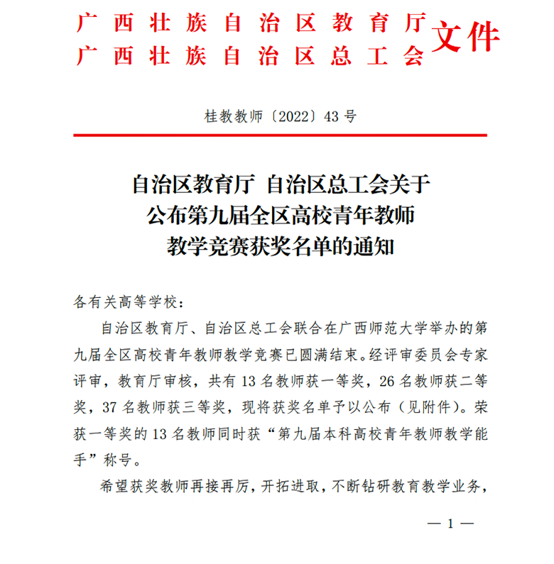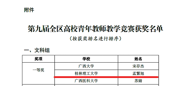 近日,自治区教育厅、自治区总工会联合下文,公布了第九届全区高校青年教师教学竞赛获奖名单。beat365选派的4位选手全部获奖,取得一等奖1项、二等奖3项的好成绩,其中外国语学院孟繁旭获文科组一等奖、理学院胡光辉获理科组二等奖、化学与生物工程学院及方华获工科组二等奖、马克思主义学院莫天荣获思政组二等奖。