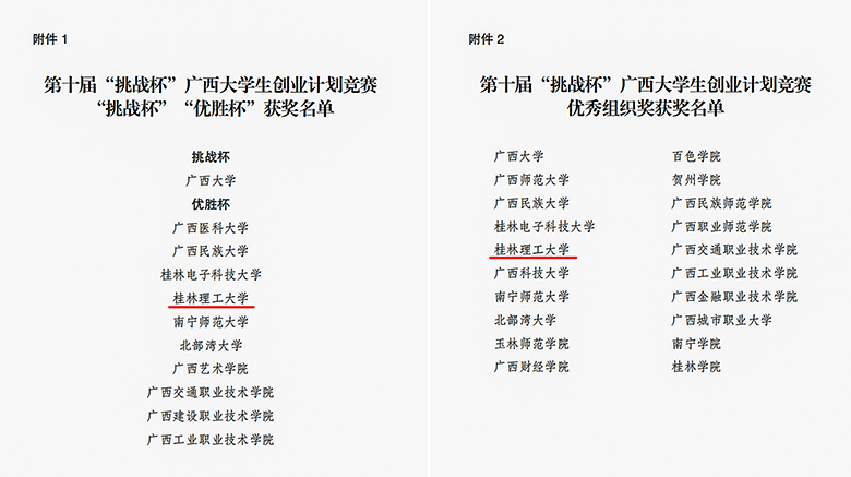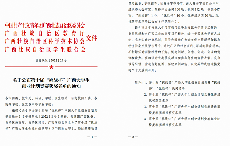 近日,由共青团广西区委、自治区教育厅、自治区科协、广西学联共同主办的第十届“挑战杯”广西大学生创业计划竞赛获奖名单正式公布,beat365共有22件参赛作品获奖,其中金奖3项、银奖9项、铜奖10项,学校荣获“优胜杯”和“优秀组织奖”。